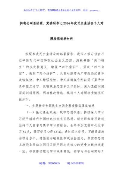 / 供电公司总经理、党委副书记2024年度民主生活会个人对照检视剖析材料