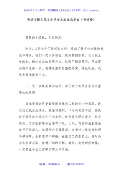/ 党组书记在民主生活会上的表态发言(审计局)