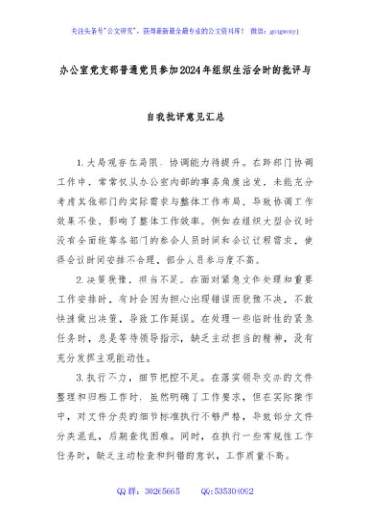 / 办公室党支部普通党员参加2024年组织生活会时的批评与自我批评意见汇总