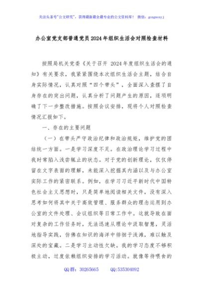 / 办公室党支部普通党员2024年组织生活会对照检查材料