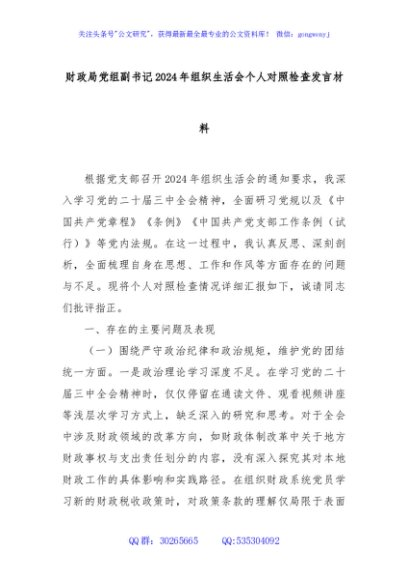 / 财政局党组副书记2024年组织生活会个人对照检查发言材料