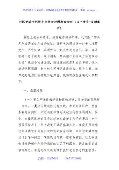 社区党委书记民主生活会对照检查材料(四个带头+反面案例)