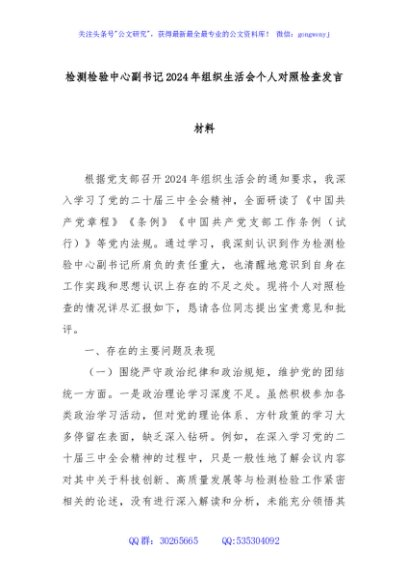 / 检测检验中心副书记2024年组织生活会个人对照检查发言材料