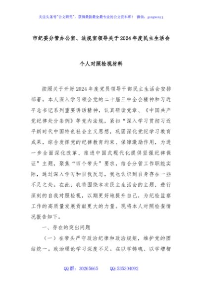 / 市纪委分管办公室、法规室领导关于2024年度民主生活会个人对照检视材料