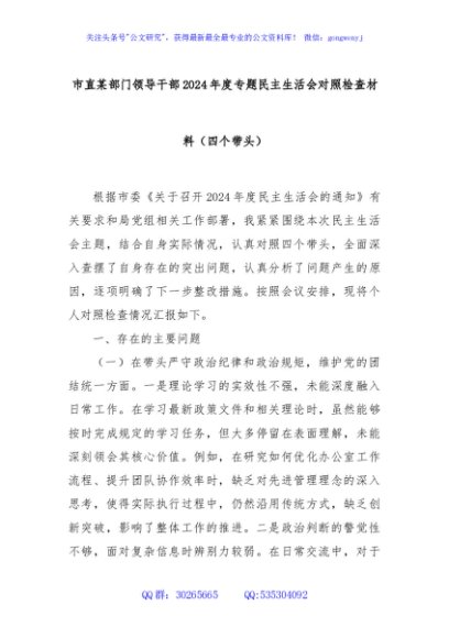 / 市直某部门领导干部2024年度专题民主生活会对照检查材料(四个带头)