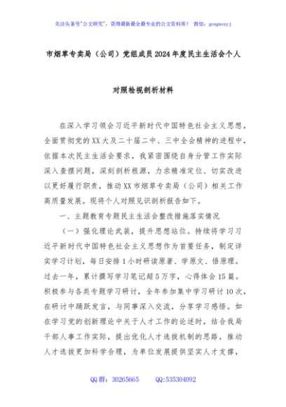 / 市烟草专卖局(公司)党组成员2024年度民主生活会个人对照检视剖析材料