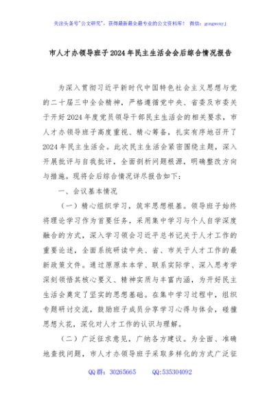/ 市人才办领导班子2024年民主生活会会后综合情况报告