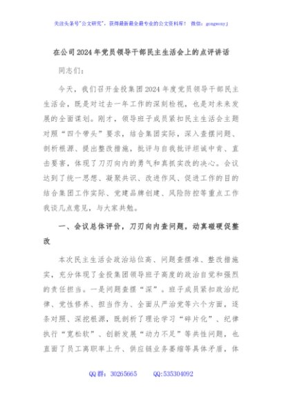/ 在公司2024年党员领导干部民主生活会上的点评讲话