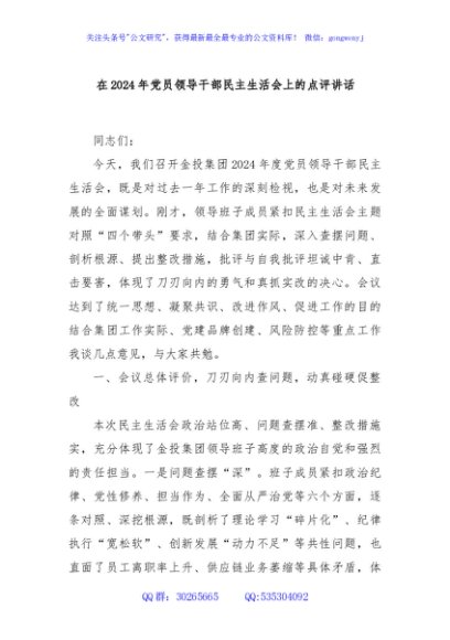 / 在2024年党员领导干部民主生活会上的点评讲话