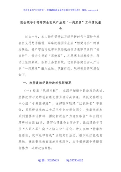 / 国企领导干部落实全面从严治党“一岗双责”工作情况报告