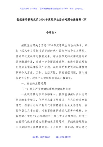 / 县级基层普通党员2024年度组织生活会对照检查材料(四个带头)