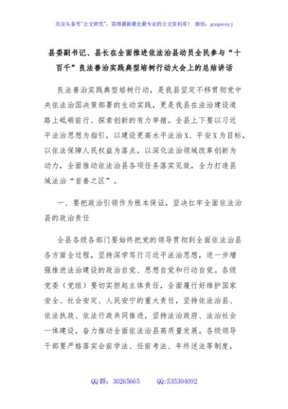 / 县委副书记、县长在全面推进依法治县动员全民参与“十百千”良法善治实践典型培树行动大会上的总结讲话
