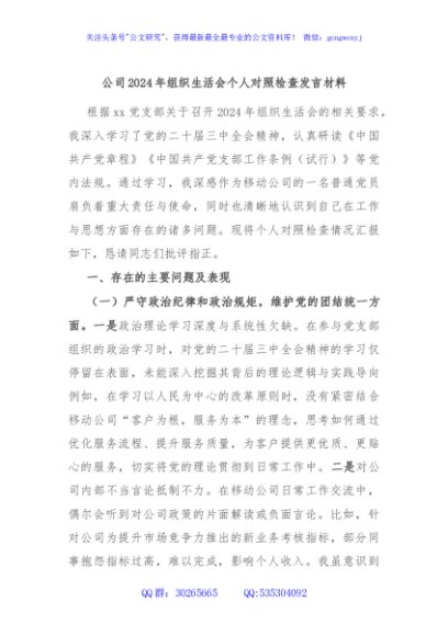 / 公司2024年组织生活会个人对照检查发言材料