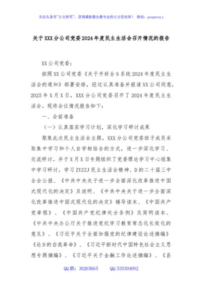 / 关于XXX分公司党委2024年度民主生活会召开情况的报告