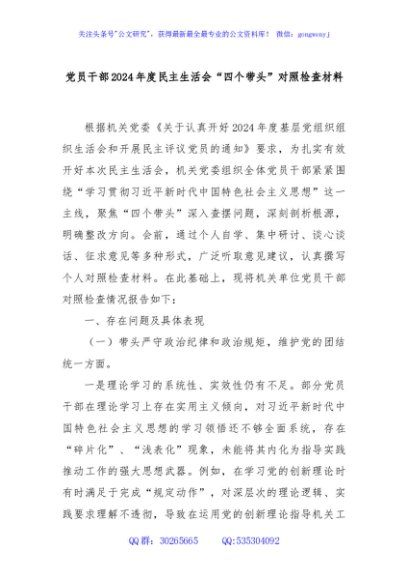 / 党员干部2024年度民主生活会“四个带头”对照检查材料