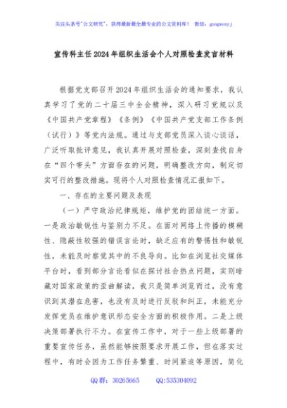/ 宣传科主任2024年组织生活会个人对照检查发言材料