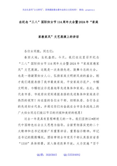 / 在纪念“三八”国际妇女节114周年大会暨2024年“家庭家教家风”文艺展演上的讲话