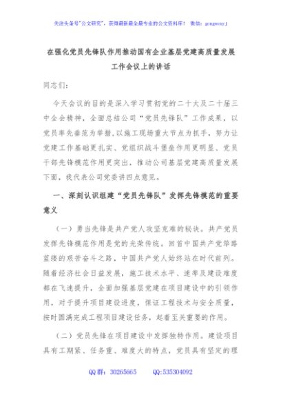 / 在强化党员先锋队作用推动国有企业基层党建高质量发展工作会议上的讲话