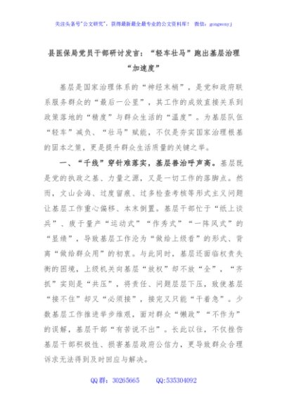 / 县医保局党员干部研讨发言:“轻车壮马”跑出基层治理“加速度”