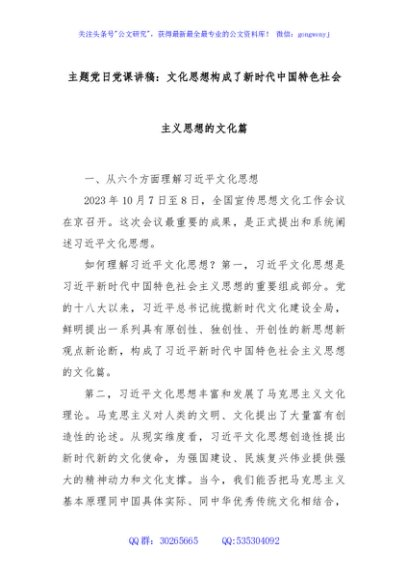 / 主题党日党课讲稿:文化思想构成了新时代中国特色社会主义思想的文化篇