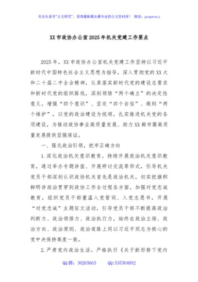 / XX市政协办公室2025年机关党建工作要点