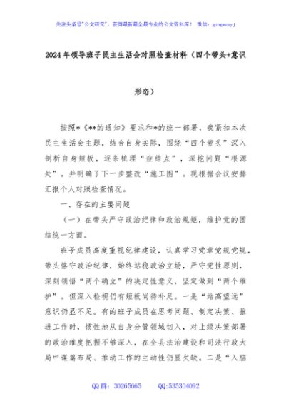 / 2024年领导班子民主生活会对照检查材料(四个带头+意识形态)