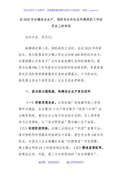 / 在2025年全镇安全生产、消防安全和生态环境保护工作动员会上的讲话