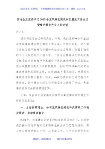 / 国有企业党委书记2025年党风廉政建设和反腐败工作会议暨警示教育大会上的讲话
