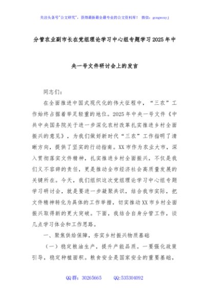 / 分管农业副市长在党组理论学习中心组专题学习2025年中央一号文件研讨会上的发言