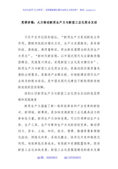/ 党课讲稿:大力推动新质生产力与新型工业化契合互动