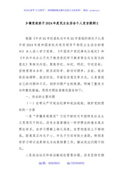 / 乡镇党政班子2024年度民主生活会个人发言提纲2