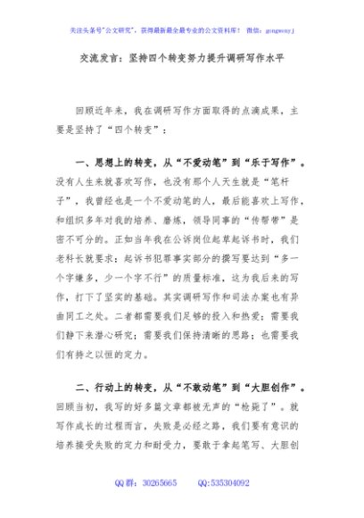 / 交流发言:坚持四个转变努力提升调研写作水平