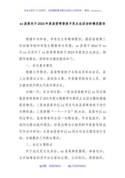 / xx县委关于2024年度县委常委班子民主生活会的情况报告