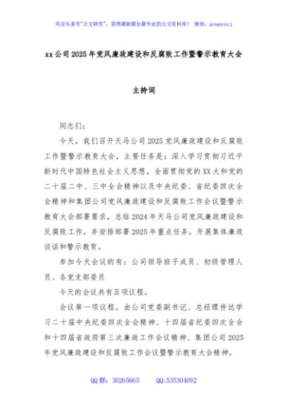 / xx公司2025年党风廉政建设和反腐败工作暨警示教育大会主持词