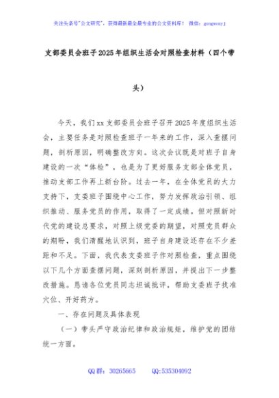 / 支部委员会班子2025年组织生活会对照检查材料(四个带头)