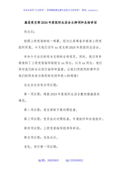 / 基层党支部2024年度组织生活会主持词和总结讲话