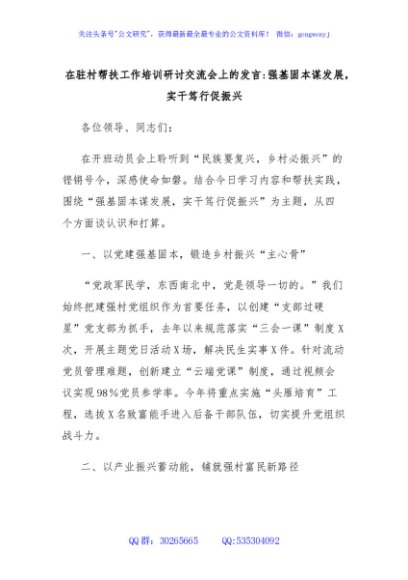 在驻村帮扶工作培训研讨交流会上的发言强基固本谋发展,实干笃行促振兴