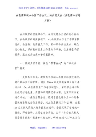 / 在政府系统办公室工作会议上的交流发言(县政府办信息工作)