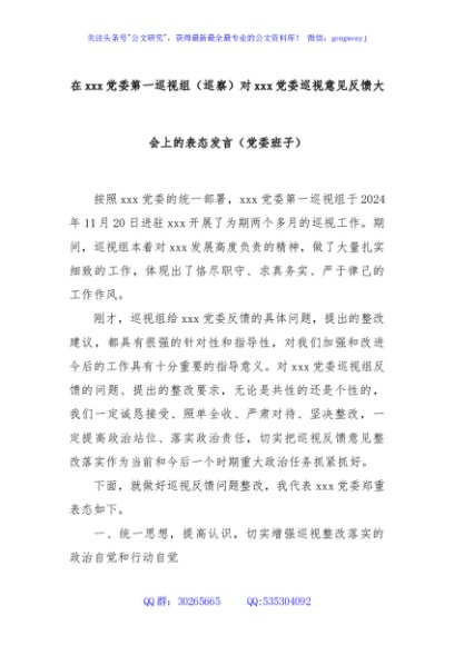 / 在xxx党委第一巡视组(巡察)对xxx党委巡视意见反馈大会上的表态发言(党委班子)