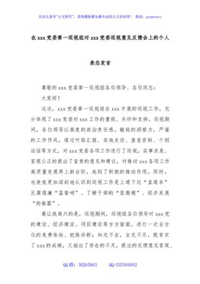 / 在xxx党委第一巡视组对xxx党委巡视意见反馈会上的个人表态发言