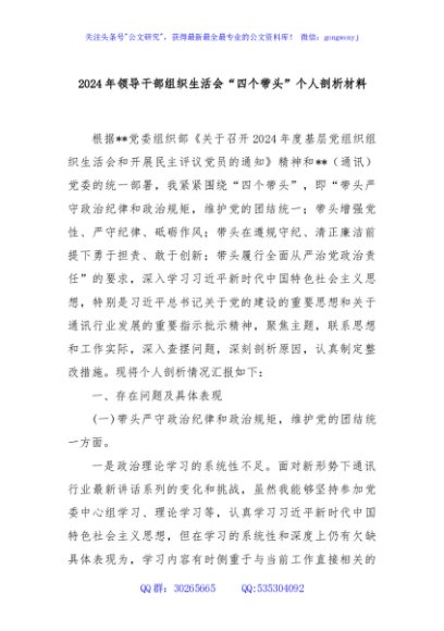 / 2024年领导干部组织生活会“四个带头”个人剖析材料