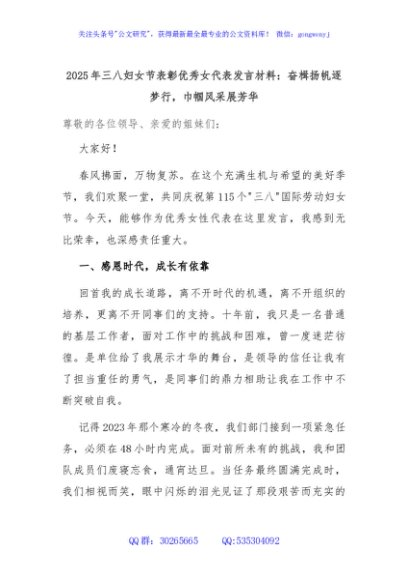 / 2025年三八妇女节表彰优秀女代表发言材料:奋楫扬帆逐梦行,巾帼风采展芳华