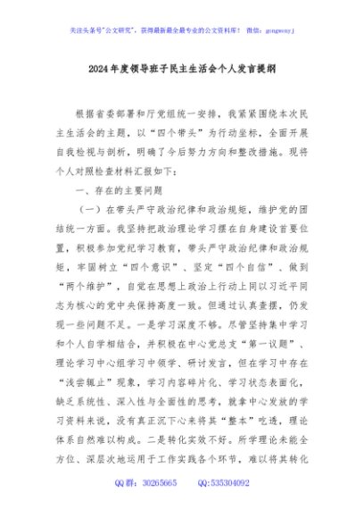 / 2024年度领导班子民主生活会个人发言提纲