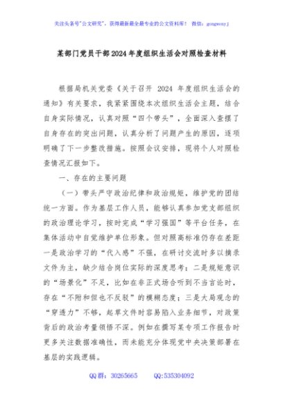/ 某部门党员干部2024年度组织生活会对照检查材料