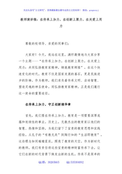 / 教师演讲稿:在传承上加力,在创新上聚力,在关爱上用力