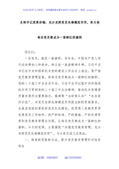 / 支部书记党课讲稿:充分发挥党员先锋模范作用,努力使每名党员都成为一面鲜红的旗帜