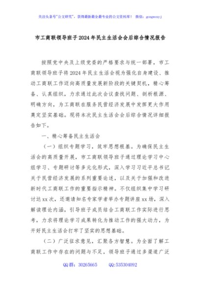 / 市工商联领导班子2024年民主生活会会后综合情况报告