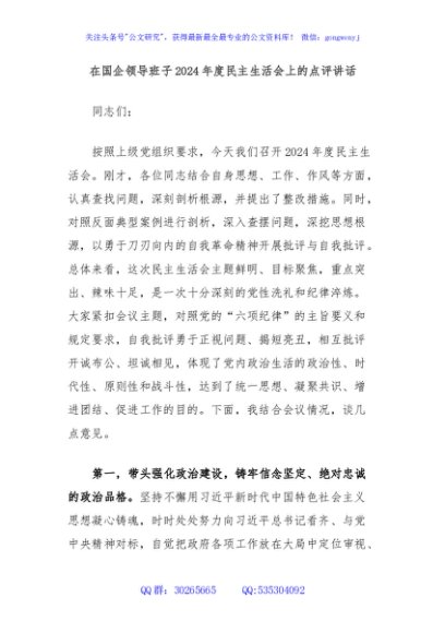 / 在国企领导班子2024年度民主生活会上的点评讲话