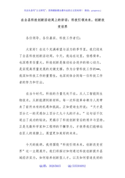 / 在全县科技创新活动周上的讲话:科技引领未来,创新改变世界