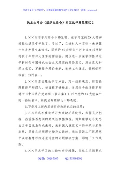 / 民主生活会(组织生活会)相互批评意见建议2